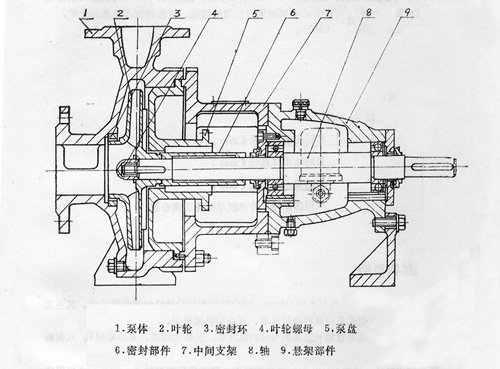 IH系列單級(jí)單吸熱水離心泵,是根據(jù)國(guó)際標(biāo)準(zhǔn)ISO2858、ISO3069、ISO3661所規(guī)定的額定性能和尺寸設(shè)計(jì)的,其主要零、部件有:泵體、泵蓋、葉輪、軸、軸套和懸架部件等。