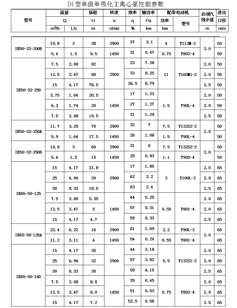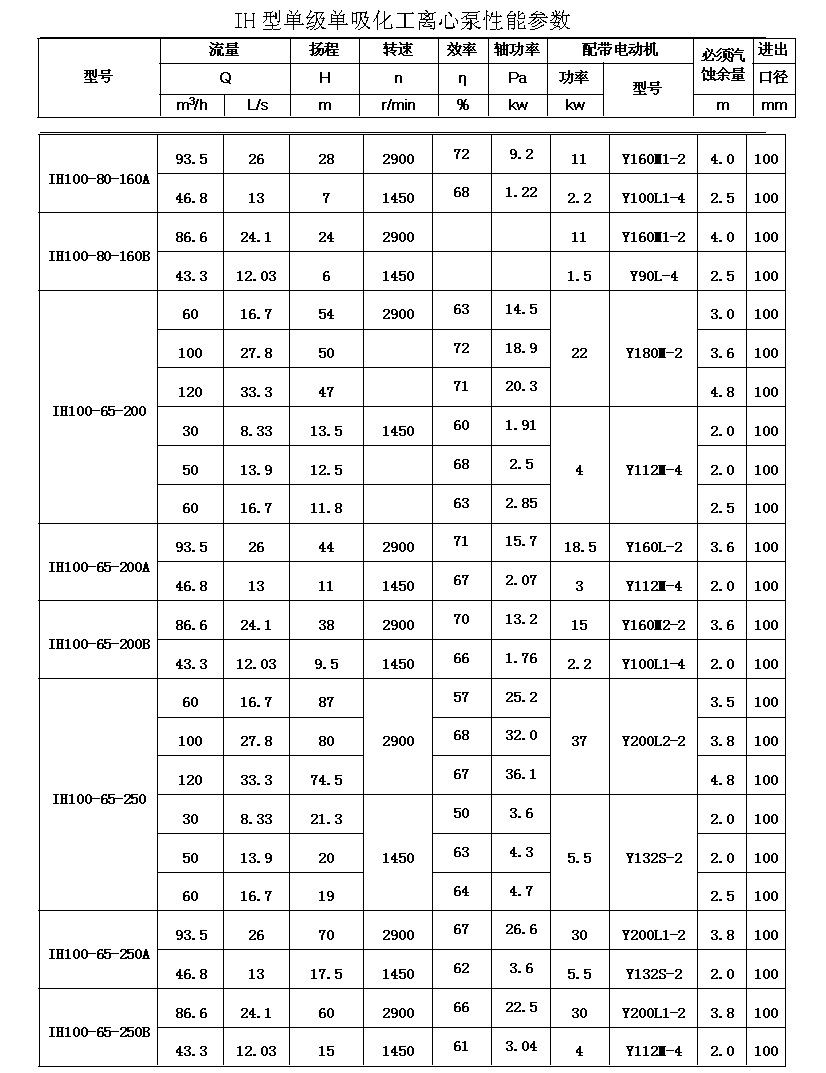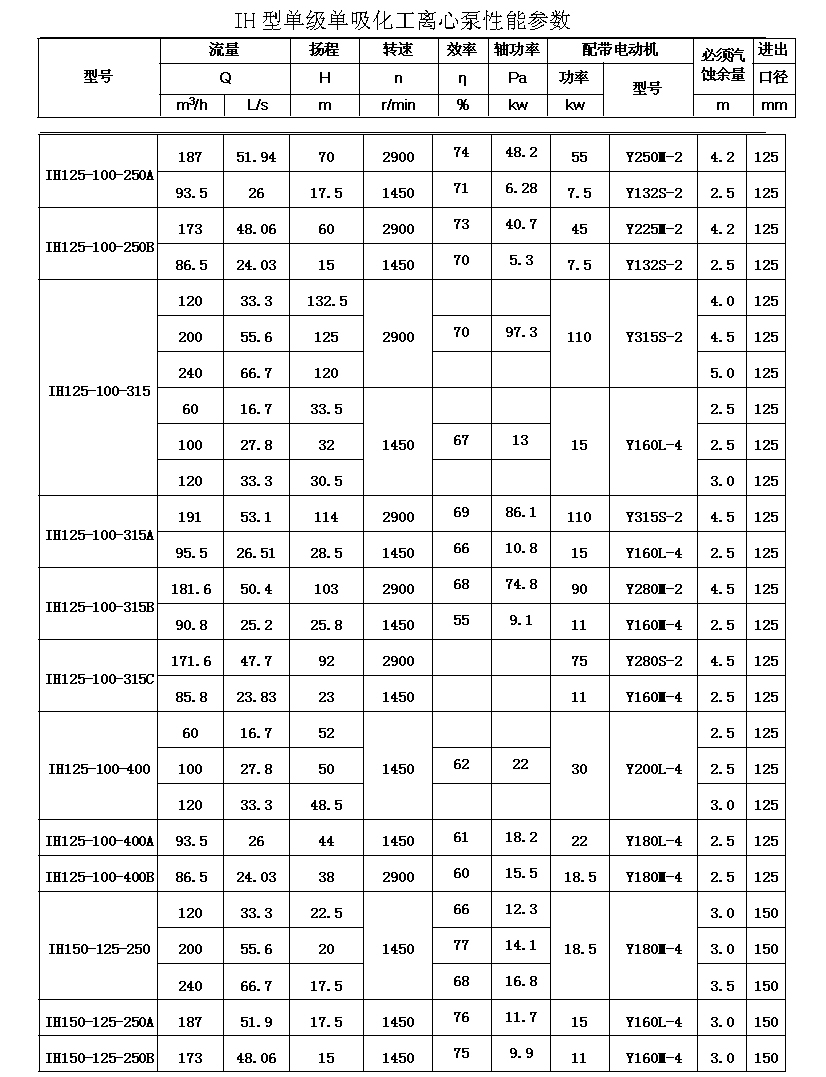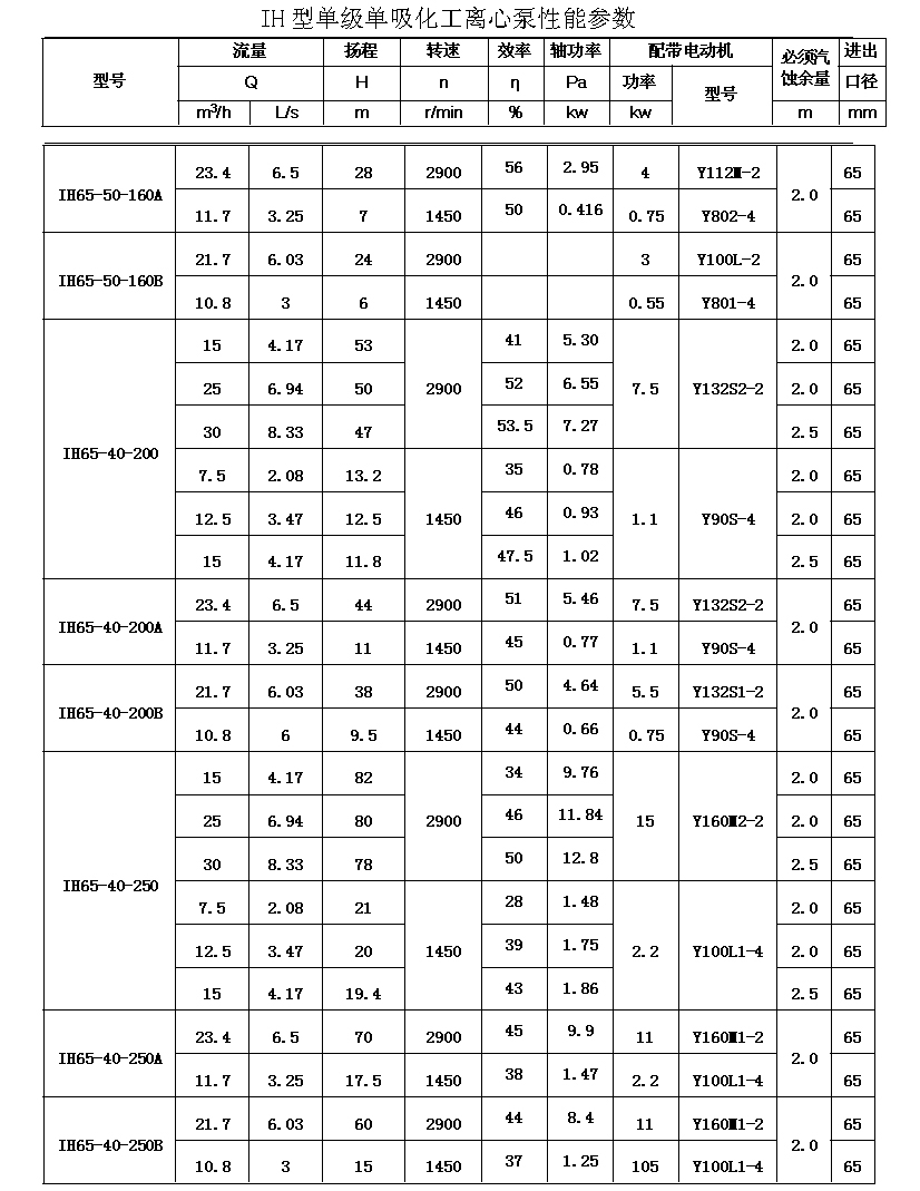 IH系列泵的性能參數(shù)為:流量為6.3~400米3/小時(shí),揚(yáng)程為5~125米。該系列泵輸送介質(zhì)的溫度一般為-20℃和105℃,必要時(shí)采取適當(dāng)?shù)拇胧?,可輸送更高溫度的介質(zhì)泵出口的***高壓力不得超過(guò)1。6Mpa。