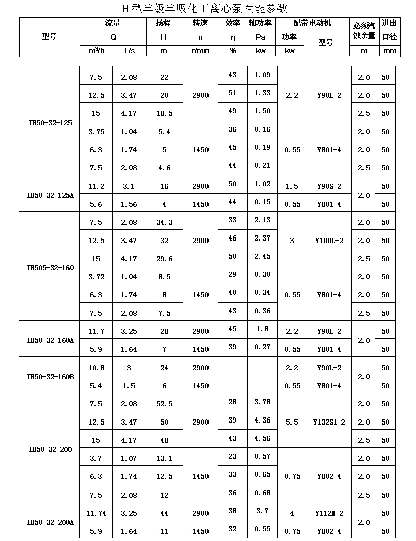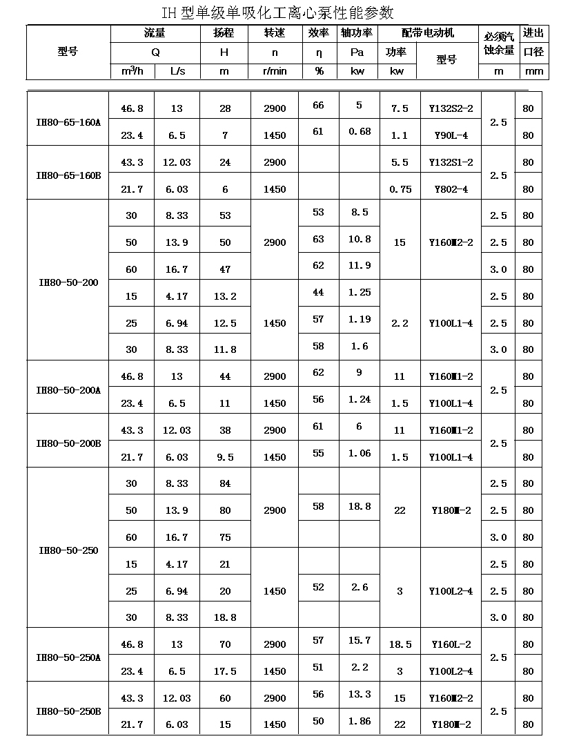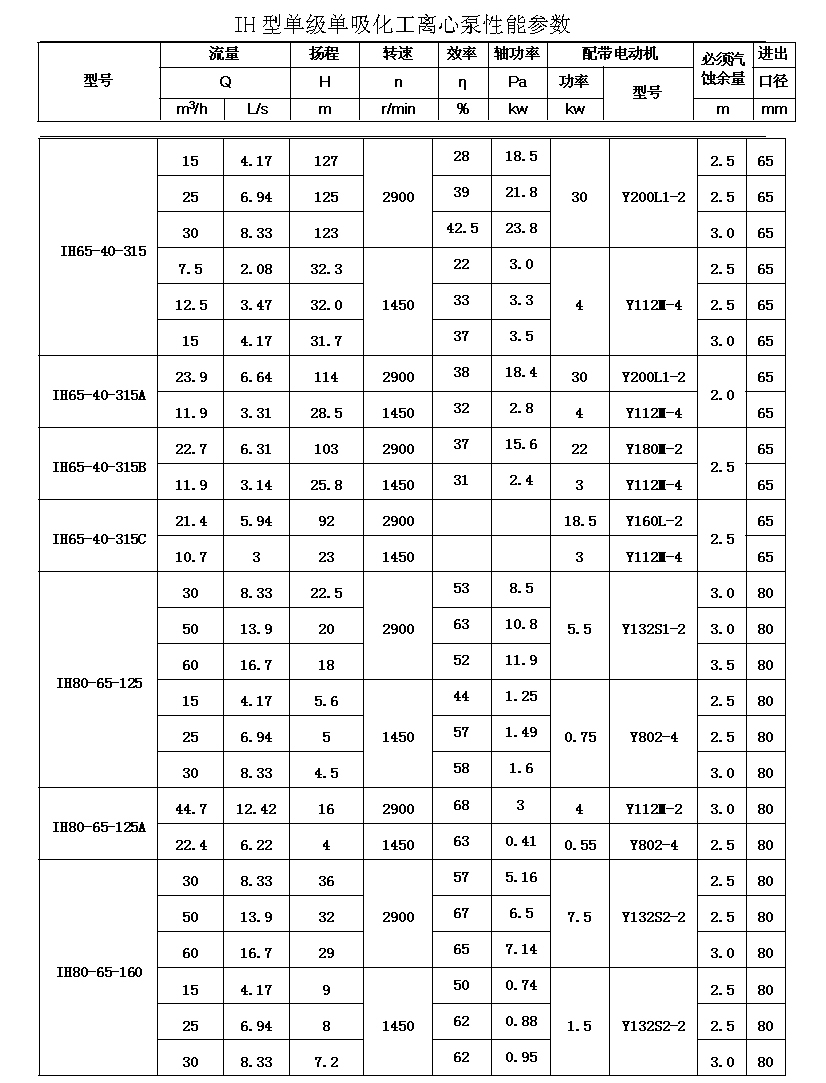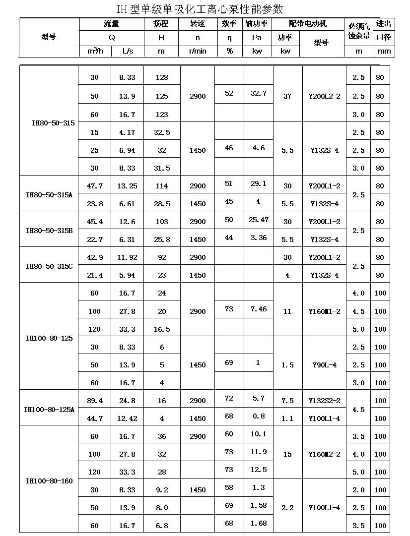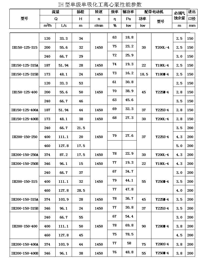 IH系列泵的性能參數(shù)為:流量為6.3~400米3/小時(shí),揚(yáng)程為5~125米。該系列泵輸送介質(zhì)的溫度一般為-20℃和105℃,必要時(shí)采取適當(dāng)?shù)拇胧?,可輸送更高溫度的介質(zhì)泵出口的***高壓力不得超過(guò)1。6Mpa。